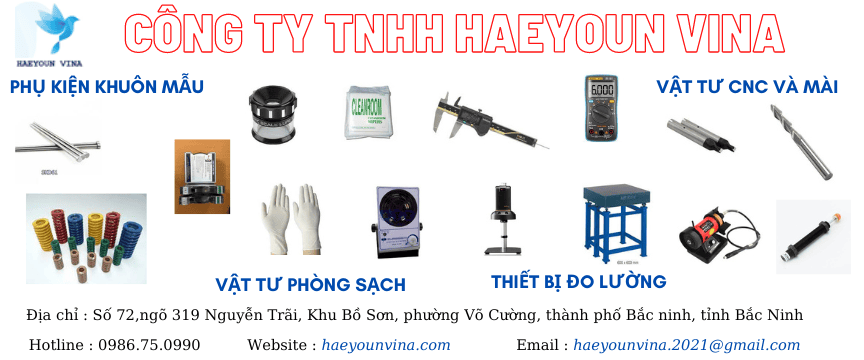 Công ty TNHH Haeyoun Vina chúng tôi là đơn vị chuyên nhập khẩu, phân phối các loại vật tư, phụ kiện ngành khuôn mẫu, máy ép nhựa như phin đẩy, bulong, vòng nhiệt khuôn, vạt tư khí nén dùng trong các nhà máy, vật tư mài đánh bóng ...